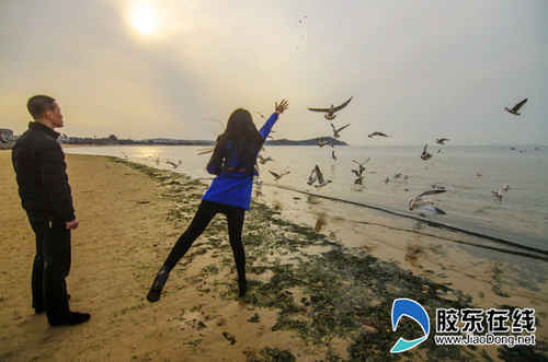 市民給海鷗喂食22日傍晚,一對年輕夫婦在蓬萊八仙渡景區西側海灘給海鷗喂食,在夕陽的映襯下,儼然一幅人鷗和諧共處的美麗畫卷。
