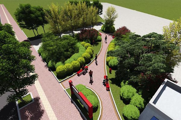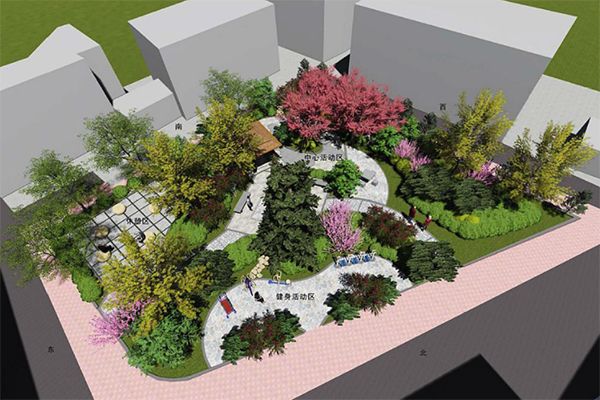 改造方案:采用灰白色透水磚鋪設(shè)地面;加設(shè)弧形座椅,放置小型活動器械,方便居民活動;西側(cè)及東側(cè)圍墻開設(shè)出入口,方便居民進(jìn)出;綠化選用整形(圓球行)蜀檜球形成樹陣;種植紅花紫薇、櫻花、紅楓、紫葉李等,造型油松點綴整個區(qū)域,對現(xiàn)有雪松、龍爪槐、蜀檜修剪成型;灌木選用紅葉石楠、金森女貞常綠灌木搭配上木烘托整個游園氣氛。