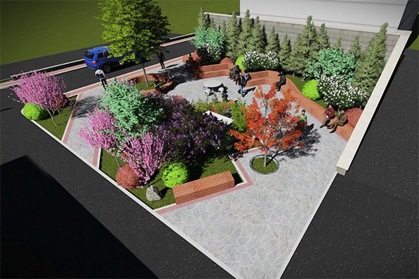 改造方案:根據(jù)現(xiàn)狀地形區(qū)分硬化及綠化范圍。硬化采用雜石花崗巖碎拼鋪裝;在硬化與綠化交接處,用紅色光面磚切筑長條椅圍樹,即耐用又美觀。保留院內(nèi)東側(cè)蜀檜,種植丁香、碧桃、紫荊、木槿等花灌木;搭配紅葉石楠球、大葉黃楊球等常綠灌木豐富園內(nèi)綠化的觀賞性。北側(cè)圍樹椅內(nèi)種植法桐,夏天可為園內(nèi)桌椅增加樹蔭,南側(cè)樹池中種植觀賞紅楓,用于提升整個公園的顏值。