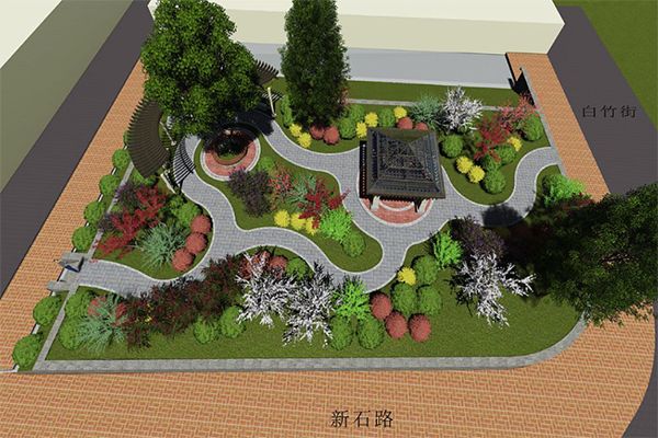 改造方案:增加涼亭、健身步道、休閑桌椅等;地面鋪裝采用白色卵石、深灰色花崗巖、淺灰色花崗巖;植物設(shè)計在保留修剪現(xiàn)有植被的基礎(chǔ)上,補植各色花灌木:碧桃、日本晚櫻、紫薇、木槿、黃金槐(金葉)、紅葉石楠球(常綠)、金葉女貞球(半常綠)等。