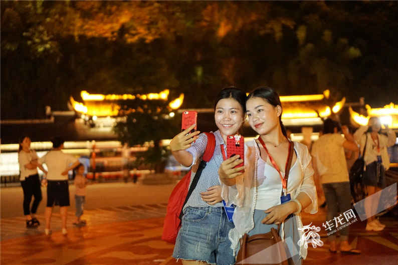 媒體記者紛紛拿出手機(jī)記錄下夜晚九黎城美景 見(jiàn)習(xí)記者 冉桐攝“白天眼見(jiàn)一幢幢古色古香的吊腳依山而建,穿梭其中感受更多的是苗家古城的別樣風(fēng)情。”光明網(wǎng)記者陳亞倩說(shuō),“而夜晚的九黎城沐浴在一片金光之中,似一顆明珠被綠水青山環(huán)抱,實(shí)在是美醉了。”
