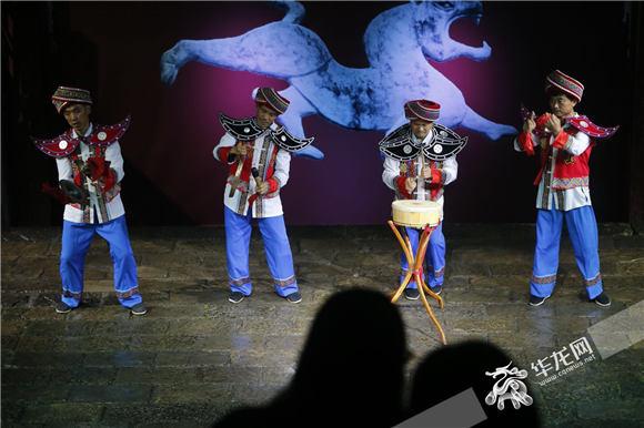 四位苗族演員表演《梯瑪古歌》節目“耍鑼鼓”記者李文科攝