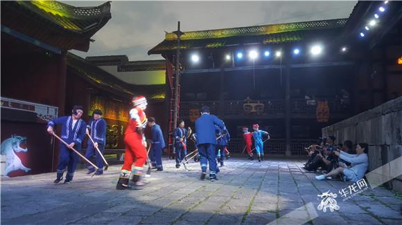 纖夫文化、碼頭文化、鹽商文化、宗教文化見證了龔灘古鎮1800年的歷史,也讓土家族、苗族的民間習俗,民間戲曲、歌舞和手工藝得以傳承,延續到今天,最終呈現在世人眼前的,就是由國家級和市級非遺項目編排打造的精品演出《梯瑪古歌》。在百名網媒記者抵達龔灘漫步夜色后,這場代表酉陽千年歷史的非遺文化盛宴在西秦會館正式開演。