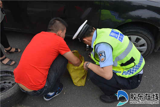 這時,正在路面進行巡邏的大隊民警正好駕車經過,看到停在路邊的車子,迅速上前詢問,得知兩人從青島來煙臺旅游,沒想到行駛途中車輛突然爆胎,而他們隨車并未攜帶換胎工具。