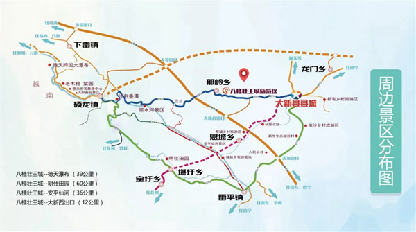 八桂壯王城(原龍宮仙境)旅游區位于廣西崇左市大新縣那嶺鄉,距離廣西首府南寧市158公里,距離大新縣縣城18公里,是一個以那嶺山水為背景,以溶洞、溫泉、休閑農業、黑衣壯族文化為載體,以溶洞風光、蝴蝶科普、冰洞體驗和溫泉療養為主要產品,融合觀光、休閑、度假為一體的綜合性民族特色度假區。景區利用天然溶洞打造了大體量冰洞項目,呈現出罕見壯觀的原生態冰雪奇觀。