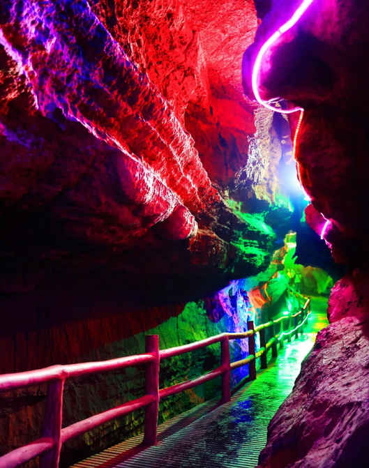 地下大峽谷高峽深澗,鬼斧神工,飛瀑流泉,濺玉噴珠。常年恒溫18℃,是集休閑、游憩、娛樂、度假和避暑的最佳旅游目的地。地下大峽谷由一條巨大喀斯特裂隙發育而成,如塑的奇石、如峽的石縫、如詩的石刻、如練的瀑布、如畫的石群、如洞的天鍋,鑲嵌其間,在炎炎夏日,和親友嬉戲于幽靜的小道,聽孱孱流水,賞絢麗奇景,不失為一個難忘的愉快體驗。
