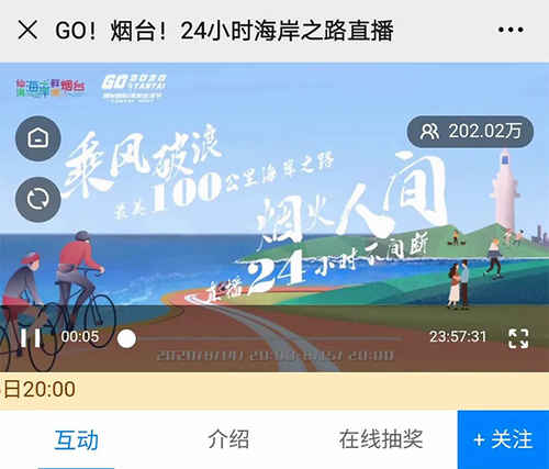 8月14日20:00-15日20:00,2020煙臺(tái)國際海岸生活節(jié)24小時(shí)海岸直播秀活動(dòng)成功舉辦,煙臺(tái)文旅云、騰訊、愛奇藝三大平臺(tái)總觀看量超過650萬,收看群體遍布山東、北京、上海、四川、甘肅、河南、陜西、重慶、廣東、河北、安徽、貴州、江蘇、浙江、新疆近20個(gè)省市,“24小時(shí)海岸直播秀”居微博同城熱點(diǎn)實(shí)時(shí)榜單首位,話題累計(jì)點(diǎn)擊27.5萬,提升了煙臺(tái)城市品牌知名度和美譽(yù)度。