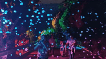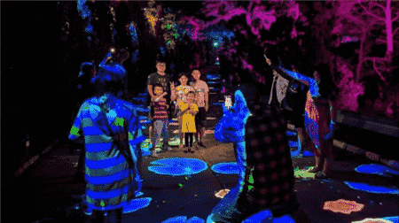 該夜游還設計了一處100米長的林間地面互動走廊。走廊兩側樹林茂密,在燈光渲染下美輪美奐;地面則是海浪、沙灘、花海……游魚、游人在其間穿行,在影像技術的幫助下,游魚與游客相互追逐,趣味十足。