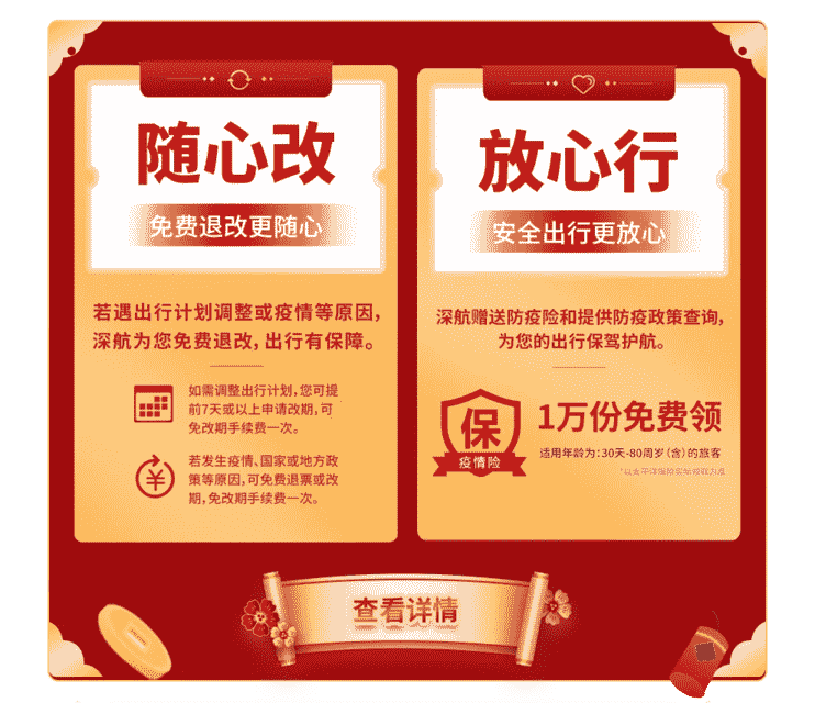 筆者還了解到,深航為了讓每位出行的旅客“隨心改,放心行,還推出了春運“雙心承諾”機票產品,旅客購買2022年1月25日至2022年2月25日起飛的深航國內航班,可提前7天免費變更一次。另外旅客還可以免費領取深航提供的1萬份“疫情險”。詳情可關注“深航先行營銷生態圈”公眾號了解更多!