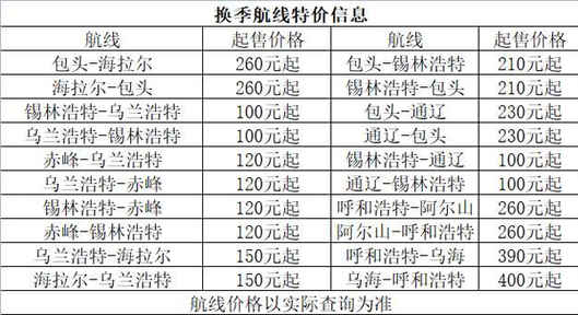 圖二 夏秋換季內(nèi)蒙區(qū)域航線特價信息表