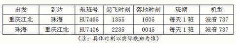 據(jù)悉,重慶-珠海航班計(jì)劃由波音737客機(jī)執(zhí)行,每天1班往返,具體班期如下: