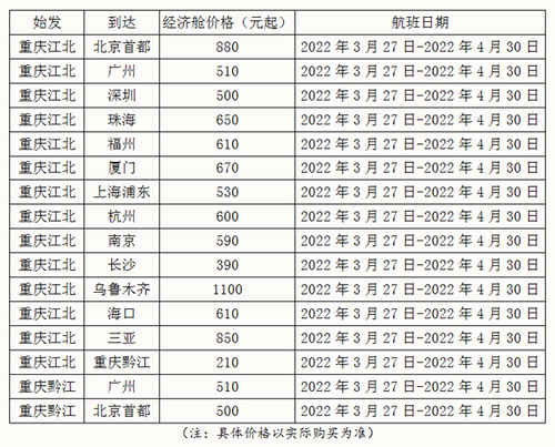 同時(shí),海南航空在重慶黔江機(jī)場(chǎng)繼續(xù)執(zhí)行重慶黔江-重慶江北、重慶黔江-北京首都、重慶黔江-廣州3條航線(xiàn)。其中,重慶黔江至重慶江北、廣州航線(xiàn)班期調(diào)整為每周二、周四、周六各1班。
