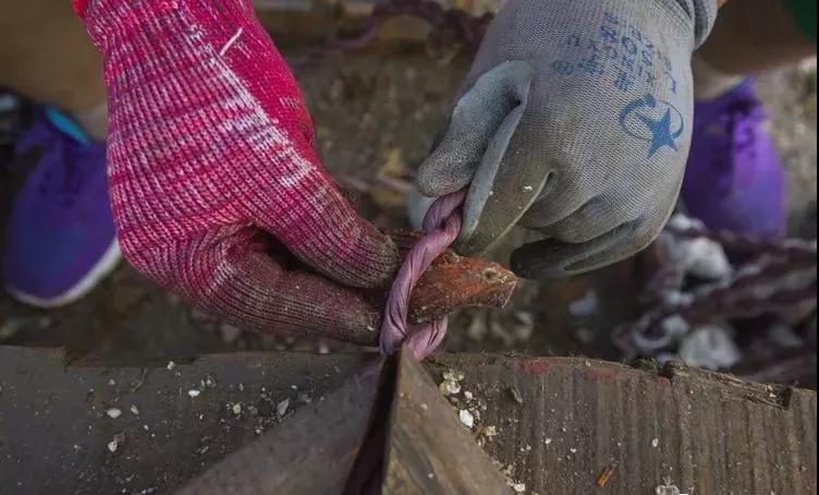 養(yǎng)殖戶(hù)及雇工們將有長(zhǎng)有小海蠣子的扇貝殼掰成小塊。