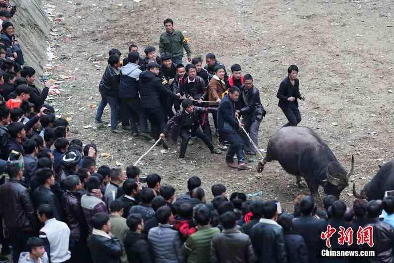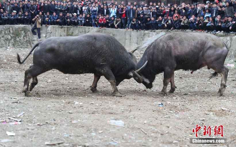 2月23日,鄉(xiāng)村斗牛比賽中。當(dāng)日,貴州省榕江縣三江鄉(xiāng)腳車村舉行民間斗牛活動(dòng),吸引了周邊村寨民眾及游客前來(lái)觀看,場(chǎng)面壯觀。中新社記者 賀俊怡 攝