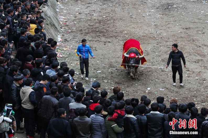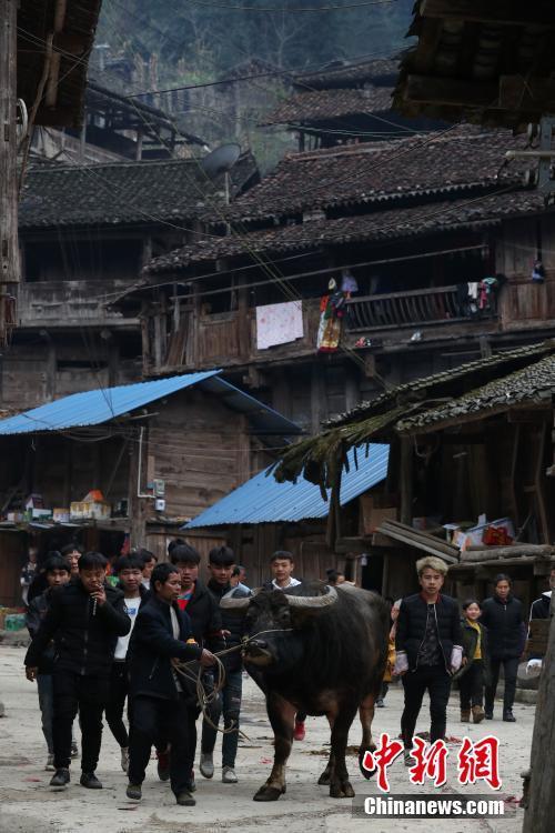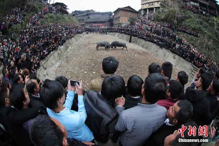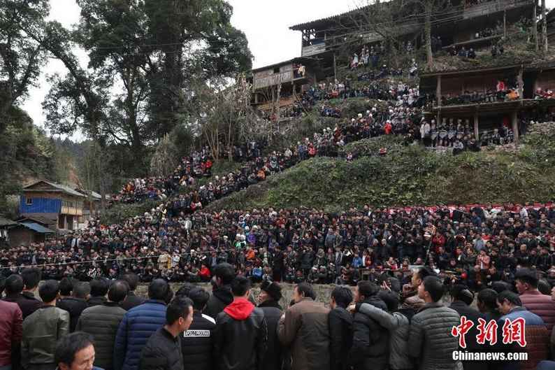 2月23日,腳車苗寨民眾在寨中觀看斗牛。當(dāng)日,貴州省榕江縣三江鄉(xiāng)腳車村舉行民間斗牛活動(dòng),吸引了周邊村寨民眾及游客前來(lái)觀看,場(chǎng)面壯觀。中新社記者 賀俊怡 攝