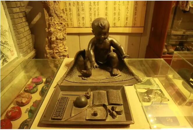 (睟盤)在榮成赤山民俗博物館中的第二展廳,有一組惟妙惟肖的場景總是讓游客記憶猶新,這就是榮成的習俗之一抓周兒。