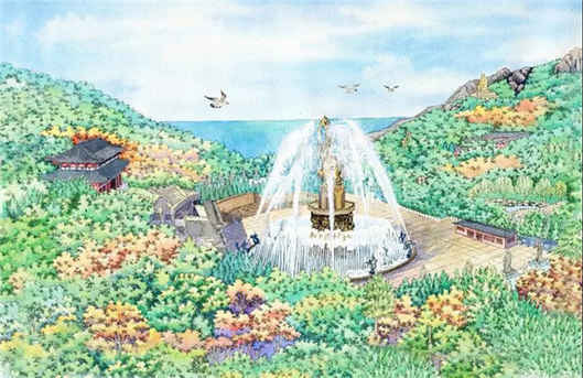 龍王早就聞聽唐開成四年(839年)六月,日本國僧圓仁法師入唐求法,足跡遍及魯、蘇、皖等七省,曾在赤山法華院住過兩年九個月,誦經并寫出《入唐求法巡禮行記》的世界三大旅行記。龍王對書中:“南北有巖岑,水通庭院,從西而東留,東方望海遠開;南西北方連峰作壁,但坤隅斜下耳……”的記述印象頗深,心想何不借機考查一下實情,以便讓“望海遠開”之水源源流入東海,為水晶宮提供清涼飲水,滋潤龍族身體。
