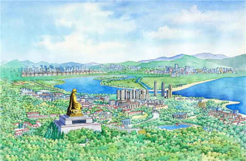 聽了這些,老鳳凰見王母有所轉念,接著又補充說:就連觀音菩薩,也在赤山設立音樂噴泉極樂菩薩界,大慈大悲普渡眾生。在西天如來佛祖那里司職的“佛法無邊”仰面佛,早在盤古開天辟地時就曾分身赤山,仰臥于此,凡間修行,從此再也舍不得離開這里,經歷了無數個七萬年,永久仰臥赤山南山之巔,與明神一道撫平海上惡浪,保佑百姓平安。這么好的地方,小鳳去了豈不是到了天堂?