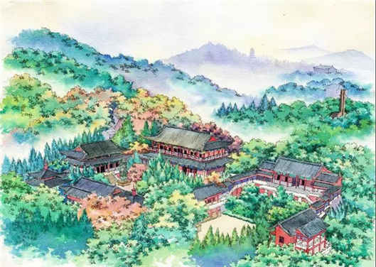 赤山閣:赤山閣高34米,共分三層,主要展示了博大精深的佛教文化。一層塑有釋迦牟尼佛像,二層塑有鑒真像,三層塑有觀音菩薩像。此外赤山閣還有多幅壁畫,表現手法以寫實的傳統工筆重彩為主,融入西洋畫、年畫、連環畫等多種元素,力求畫面生動活潑,人物形象逼真。壁畫分為三部分:一樓為《釋迦牟尼八相成通》;二樓為《中國高僧傳》;三樓為《中國四大菩薩》。其中“高僧傳”壁畫是目前我國所有寺廟中唯一的一套反映中國歷代高僧的工筆重彩壁畫。它收錄了自東漢明帝年間印度高僧攝摩騰首次來中國弘法到民國時期弘一法師李叔同圓寂共24位高僧,展示了自漢明帝時期到民國前后共1800多年的中國佛教史。