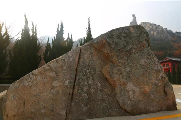 “千年一寺連三國,罕見天成仰面佛”。公元824年新羅人張保皋始建赤山法華院,839年日本國僧圓仁法師入唐求法,客居赤山法華院達2年9個月,可謂一座千年古剎,連接了中韓日三國人民的民間友誼。“罕見天成仰面佛”即從赤山法華院三佛寶殿殿前向正南方目測到的渾然天成仰面佛。頭頂朝海,仰面朝天,神態儼然,像歷史見證一般巋然仰臥赤山南麓,守望著膠東沿海。形成于哪個年代已無從考證,大概榮成市東南沿海赤山、鐵槎山山脈遠古形成時期就已經存在。