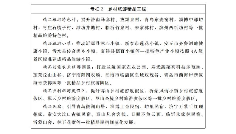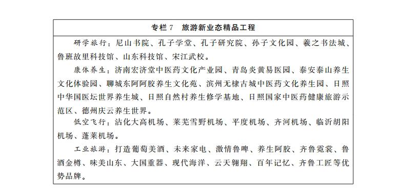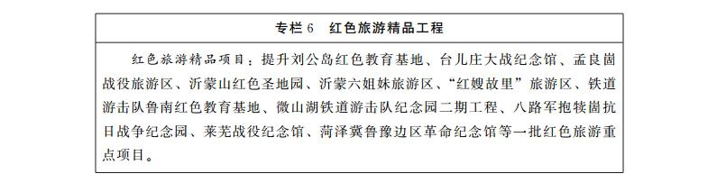 建設6大精品旅游發展高地:曲阜東方圣城中國傳統文化精品旅游發展高地,齊國故都齊文化精品旅游發展高地,沂蒙紅色文化精品旅游發展高地,青煙威精品海洋旅游發展高地,黃河三角洲生態文化精品旅游高地,濟南泉文化精品旅游高地。