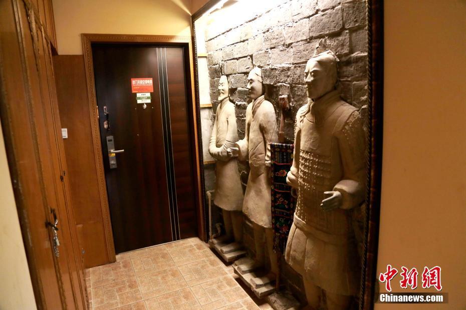 11月27日,民宿進門處的三尊“兵馬俑”裝飾如同門神。近日,西安一家主打“兵馬俑”元素的民宿走紅,“兵馬俑”元素遍布在房間各個角落,“深情注視”著在此休憩的旅客,加上昏黃的燈光及復古的裝飾,讓不少旅客感嘆如同居住在“秦始皇陵”。中新社記者張遠攝
