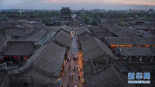 這是7月19日無人機拍攝的夕陽下的平遙古城。