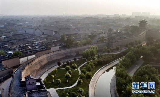 這是7月20日無人機拍攝的平遙古城墻與護城河。平遙古城城墻總周長6163米,墻高約12米,把面積約2.25平方公里的平遙縣城隔為兩個風格迥異的世界。城墻以內街道、鋪面、市樓保留明清形制,城墻以外為新城。