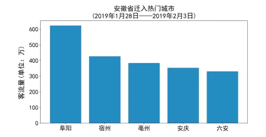 預計1月28日至2月3日期間,安徽省客流遷入量大于遷出量。其中,阜陽、宿州、亳州、安慶、六安等城市客流遷入量排名靠前。主要客源地來自江蘇、浙江、上海、河南、廣東等。