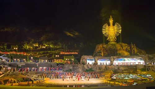 《金山佛諭》演出位于“亞洲第一金山”——山東招遠羅山,以羅山鬼斧神工的地貌景觀及周圍的山脈走勢為背景,打造了最耀眼的180°全景式自然山水舞臺。全劇共分四幕五個篇章,以古代招遠人羅山采金為故事背景;以人物栓柱和杏花的愛情故事為主線貫穿整個劇情,穿插古法淘金、煉金、民間剪紙、粉絲傳統制作工藝展示等,引用渤海灣大地震中觀音菩薩險中救八難的神話傳說來演繹整個故事的發展與善終結局,一句經典的臺詞教育人們“人,做不了觀音,心,得按觀音做。”