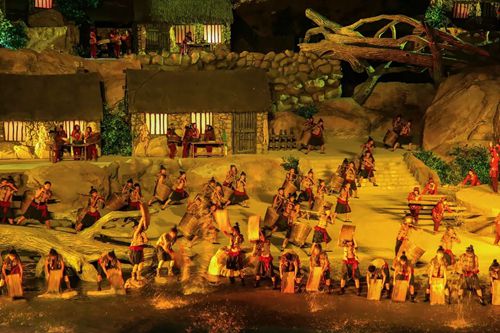 整場舞臺設計將金都招遠乃至膠東地區的有關采金、拉磨、農耕、粉絲、剪紙、婚禮場景、膠東秧歌等民俗民風民間特色一并納入其中。讓觀眾通過一臺戲了解招遠采金歷史,一臺戲讀懂膠東民俗文化,一臺戲詮釋人生……劇場依山臨水而建,氣勢磅礴,真山真水真人,在頂級的燈光舞美映襯之下,由二百余名專業的舞蹈演員精彩表演,利用現代高科技聲光電技術、舞美制作和大規模的演員陣容來演繹膠東特色文化,創造出一幅美輪美奐的畫面意境,徹底顛覆了“傳統舞臺”的表演形式,使觀眾在自然劇場中身臨其境,體驗從未有過的視覺與聽覺感受,打造了一種全新的、震撼的藝術視聽盛宴。自開演以來,獲得社會各界一致好評,彌補了招遠及周邊旅游項目的夜間空白,對整合旅游資源,拉動地方經濟,提升城市品位具有積極的意義,逐步成為招遠乃至煙臺的文化旅游城市名片。