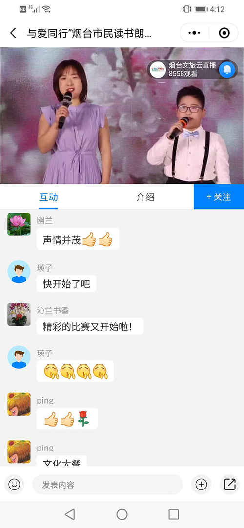 直播間煙臺市已連續(xù)舉辦十屆讀書朗誦大賽,比賽全程在網(wǎng)上舉辦還是首次。網(wǎng)上舉辦,使比賽不受時空限制,因此在眾多參賽選手中,增加了許多新鮮面孔,進一步擴大了讀書朗誦大賽的影響力。第一次參加朗誦大賽的王增磊先生說:“無聲的文字,配上有聲的朗讀,道出內(nèi)心對‘逆行者’們的牽掛、誦出我心中的期盼。我用參加朗誦比賽的方式向抗疫一線中所有的‘逆行者’們致敬,向每一位做出貢獻的平凡人致敬。希望能通過這個活動,讓正能量的抗疫之聲傳得更遠。”