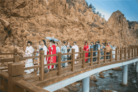 游船抵達大黑山島龍爪山景區,作為擁有中國北方最長的海蝕棧道、天門洞開、聚仙洞等近10處網紅打卡點的國家地質公園,吸引了漢服愛好者拍照打卡。