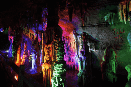 玉筍奇石醉萬年。洞外沐春光,洞內有仙境,石筍、石鐘乳、石柱、石瀑、石旗……渾然一體,在彩燈的照耀下,姿態萬千,美景盡收眼底。