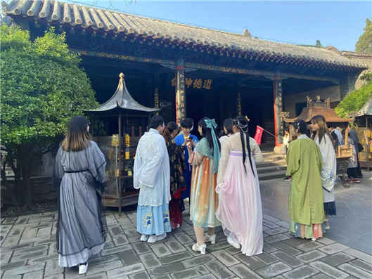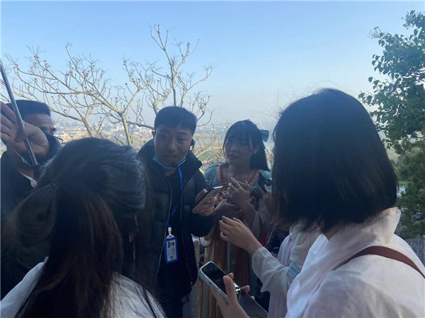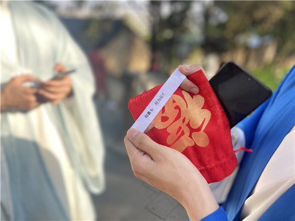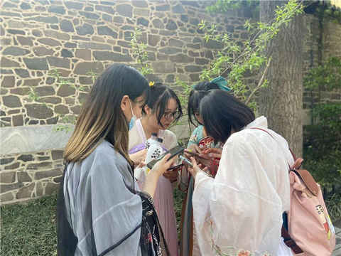 導游以npc身份參與一群身穿漢服的年輕人,聚集討論、線索推理、尋找錦囊、求助游客、游戲復盤……這些游戲環節迅速引發了游客的好奇心,同時也讓游戲玩家帶領游客零距離參與劇本情節,通過一個又一個線索,打開“劇本+游園”創意活動新形式,不僅讓參與的活動漢服愛好者感受了“當演員、推理者”的樂趣,更是讓激發了現場游客的興趣,主動幫忙玩家解答問題,參與活動。